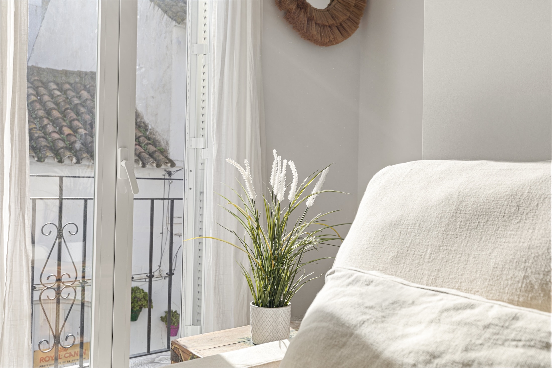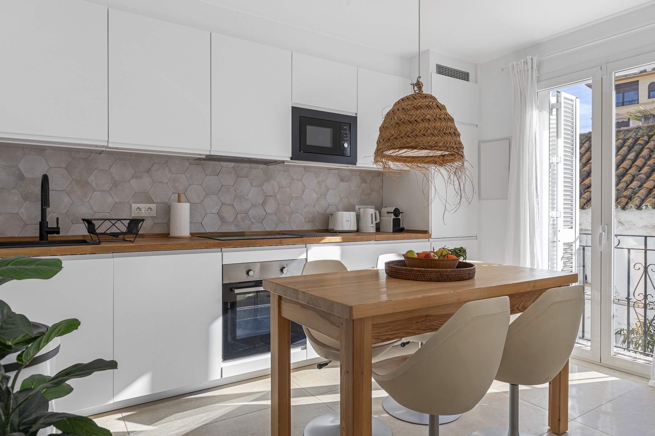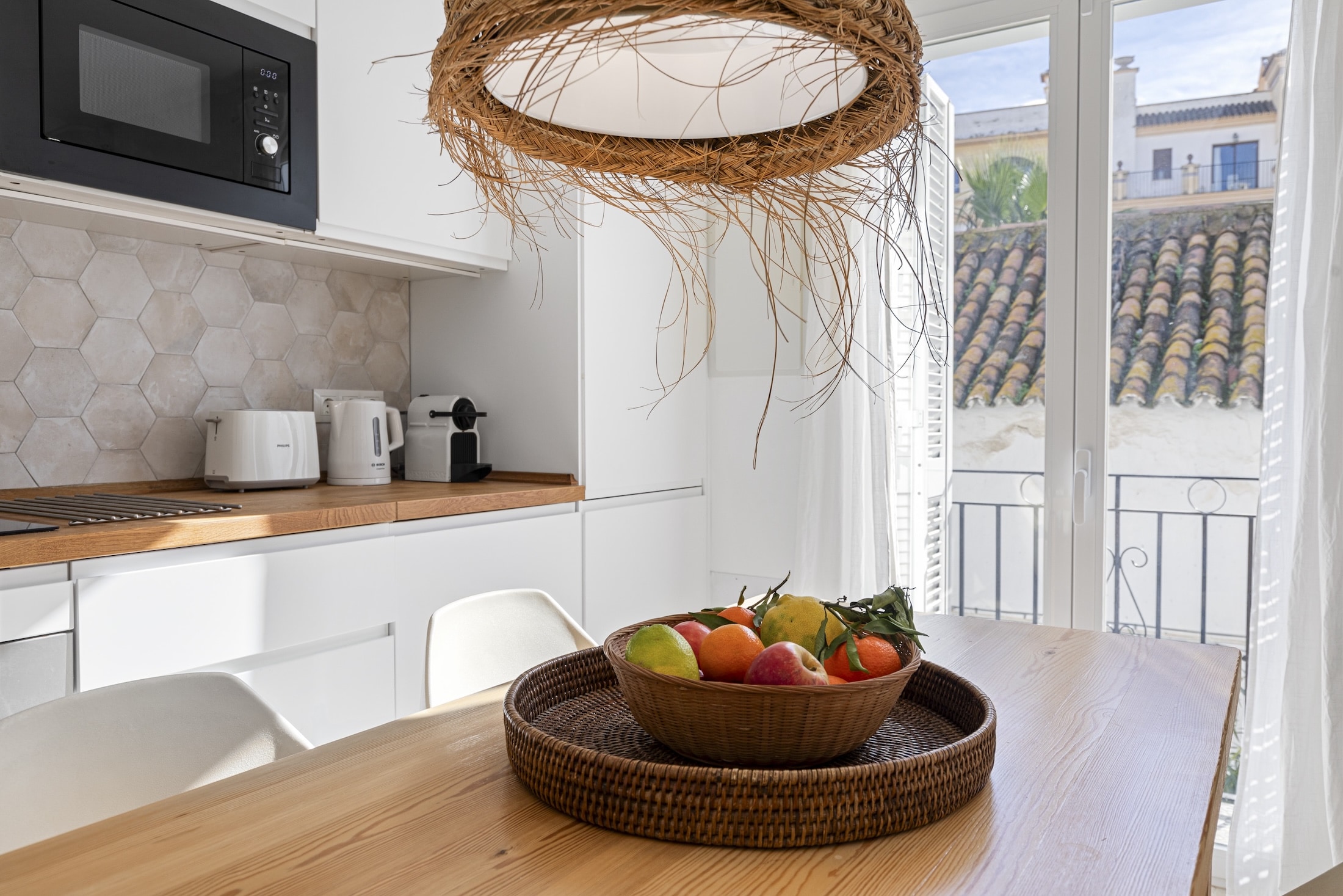 El salón es amplio y muy luminoso, con una cocina abierta moderna y totalmente equipada, perfecta tanto para un desayuno rápido como para disfrutar cocinando sin prisas. Además, tiene dos balcones muy agradables que dan a la calle Sevilla y llenan el espacio de luz.