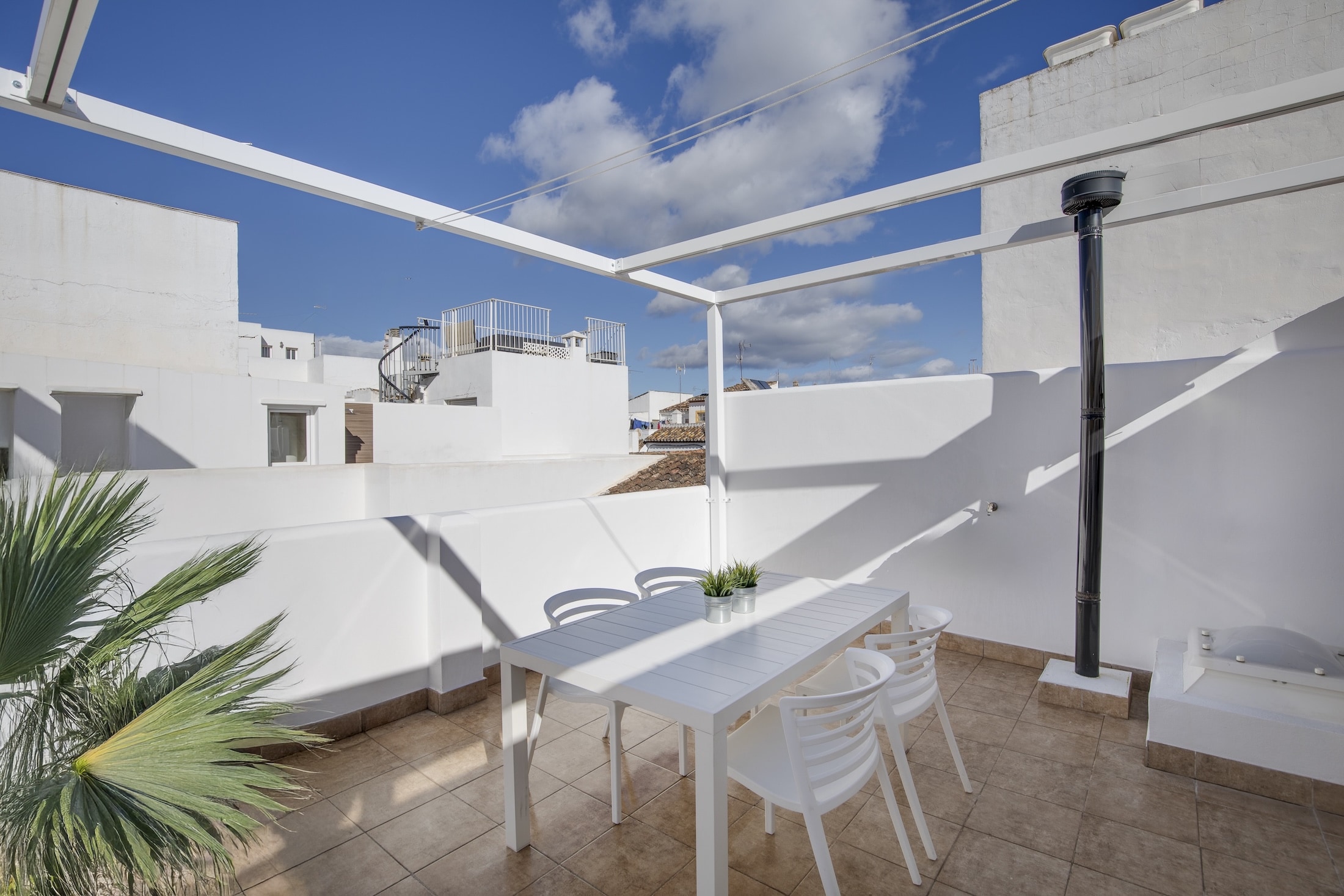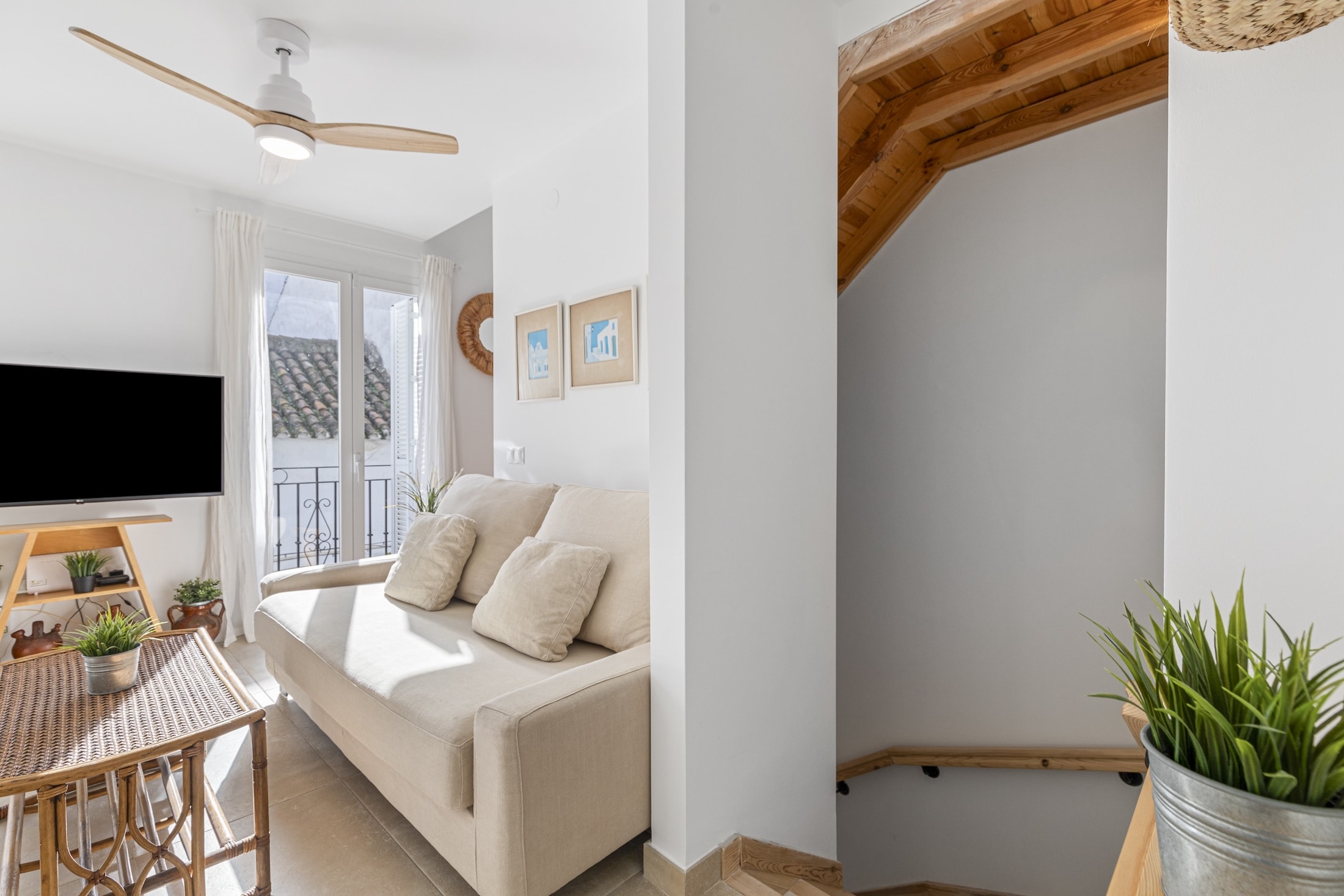 La casa dispone de tres dormitorios, uno de ellos en suite, y dos baños completos, ofreciendo un espacio funcional y confortable. El área principal integra salón, comedor y cocina abierta, creando un ambiente práctico y luminoso. La cocina es moderna y está totalmente equipada, y los dos balcones aportan luz natural y vistas a una de las calles más emblemáticas del centro histórico.